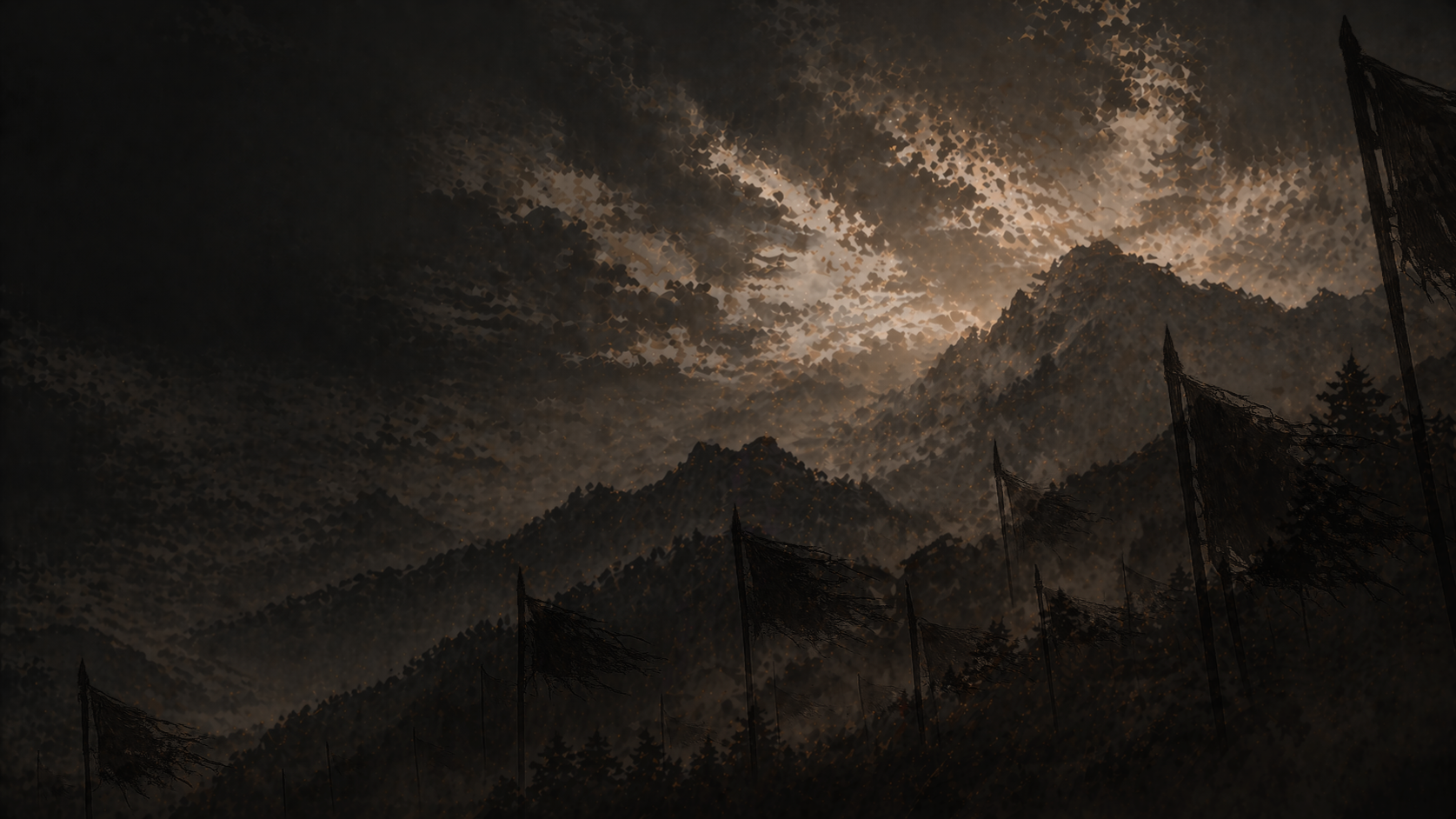 Embers drifting beneath an ashen sky